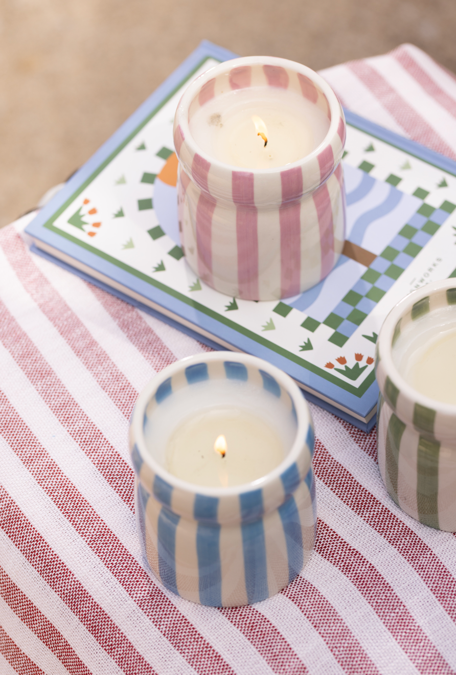 Transport yourself to the world’s most beautiful beaches with our Cabana collection, each designed to evoke the soothing, transformative scents of coastal destinations. These hand painted candles inspired by striped umbrellas are 6.5oz and feature a unique pinched form.
