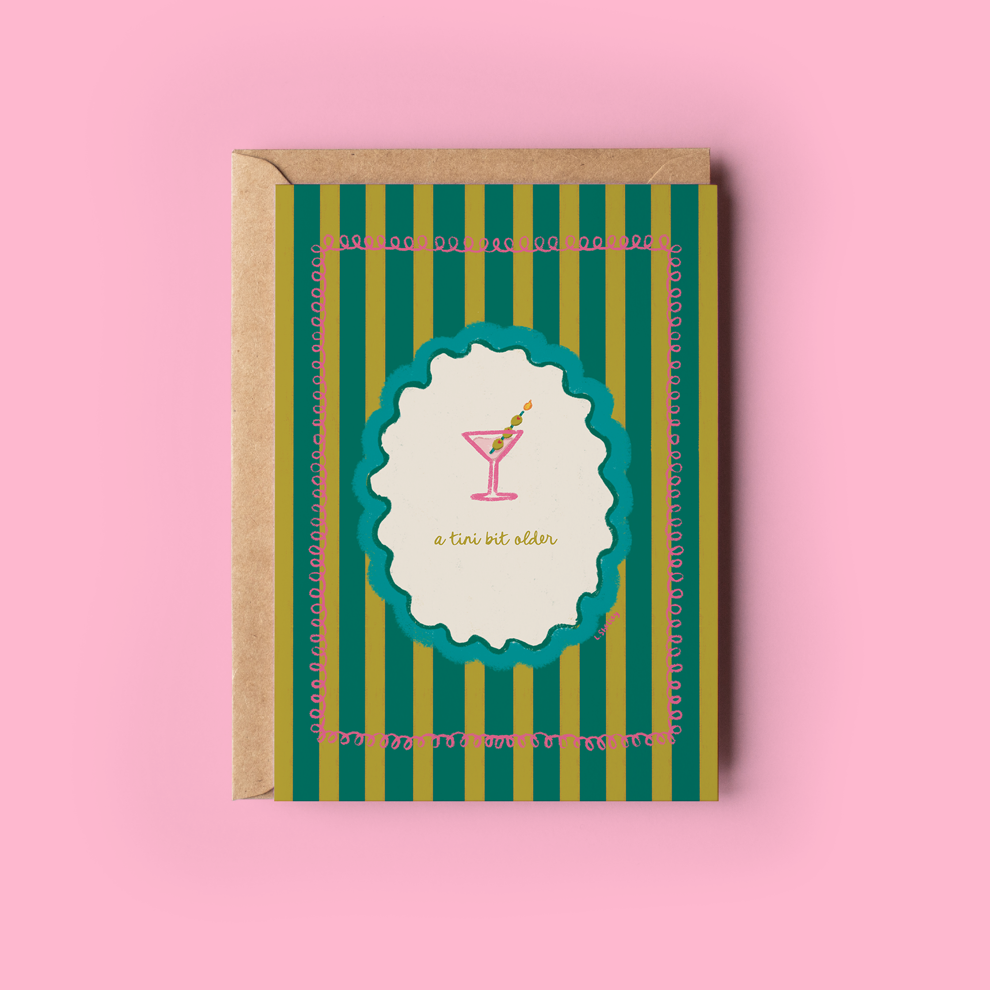 Send a tini birthday wish with this adorable 5x7 birthday card, featuring a pink martini glass with adorable olives on a lit candle and the phrase "a tini bit older". The card is blank inside for your own personal message, and comes with a brown kraft envelope. Perfect for birthdays, 21st birthdays, and martini lovers!