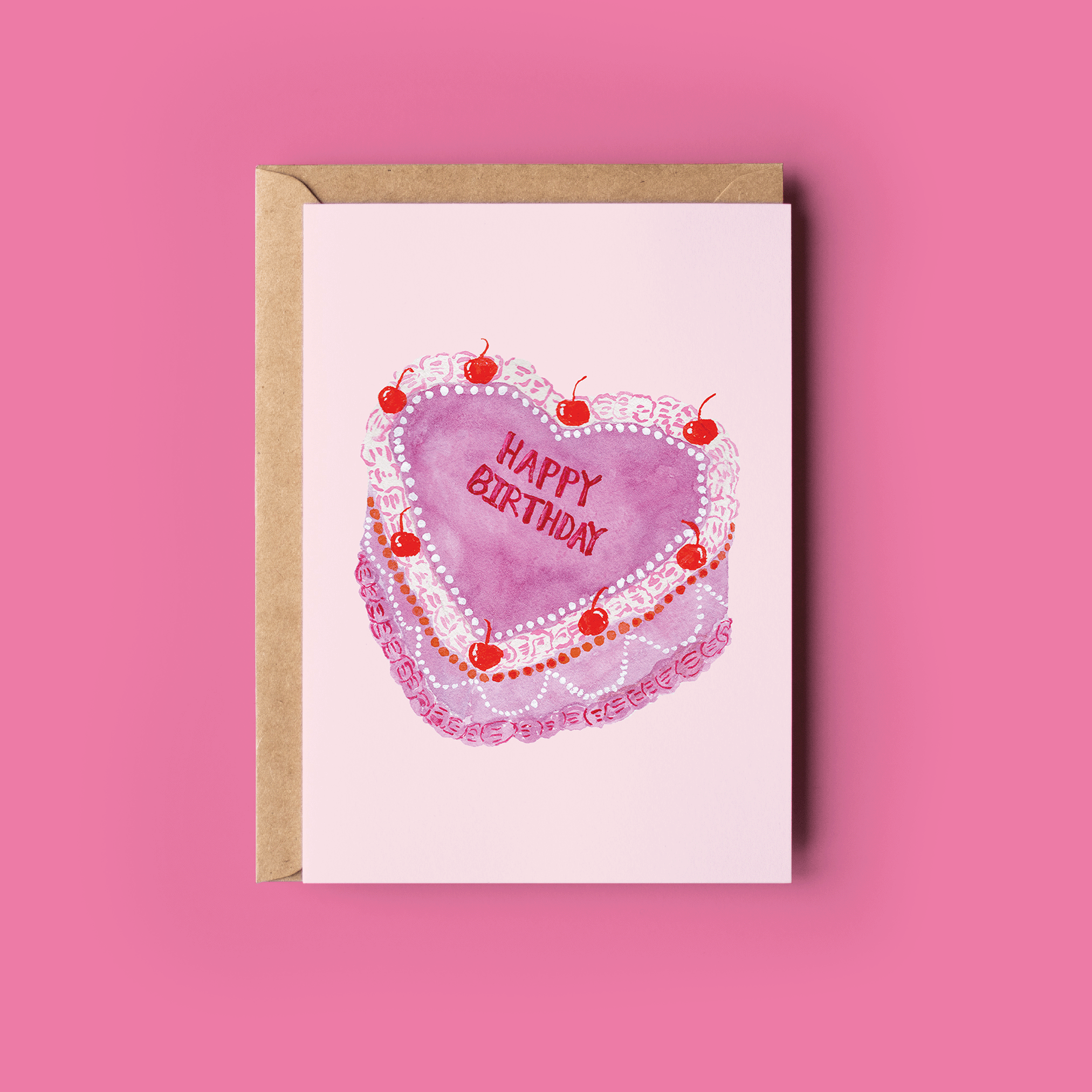 Give some heartfelt birthday wishes with this eye-catching 5x7 birthday card, featuring my watercolor artwork of a heart cake with cherries on top and the phrase "Happy Birthday". The card is blank inside for your own personal message, and comes with a brown kraft envelope. Perfect for birthdays, coquette birthdays, dessert lovers, and more!