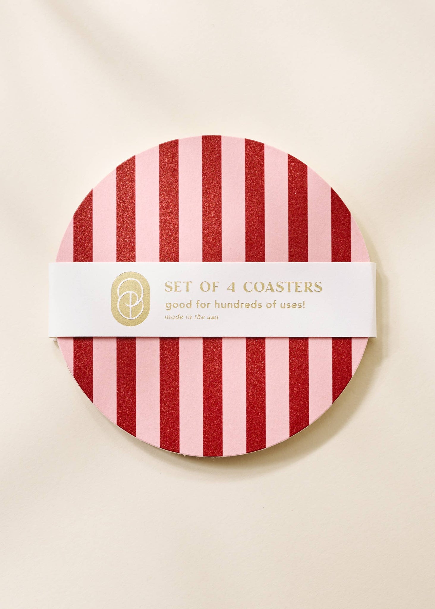 Our coasters are comprised of wood pulp, made exclusively with shavings from sustainable forestry. They are printed with UV ink, and packaged with a foil-pressed belly band made of recycled cotton paper.